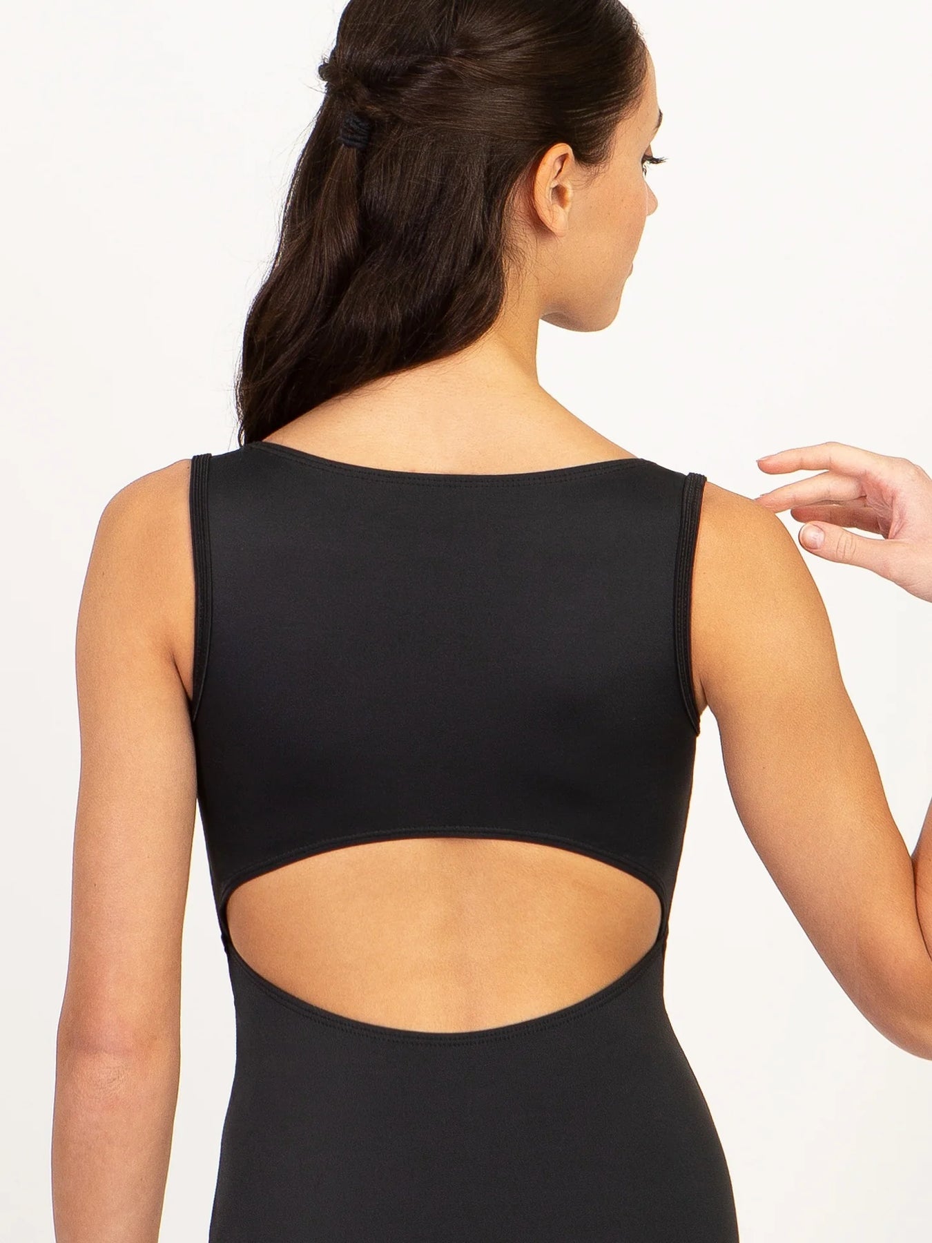 V front tank leotard with ribbed accents and cut-out back. The Contour Collection was inspired by ultra chic streetwear brands and reimagined for the dance studio. It features structured lines, flattering ribbed fabric, and new fashion forward bodies in cool winter colors.