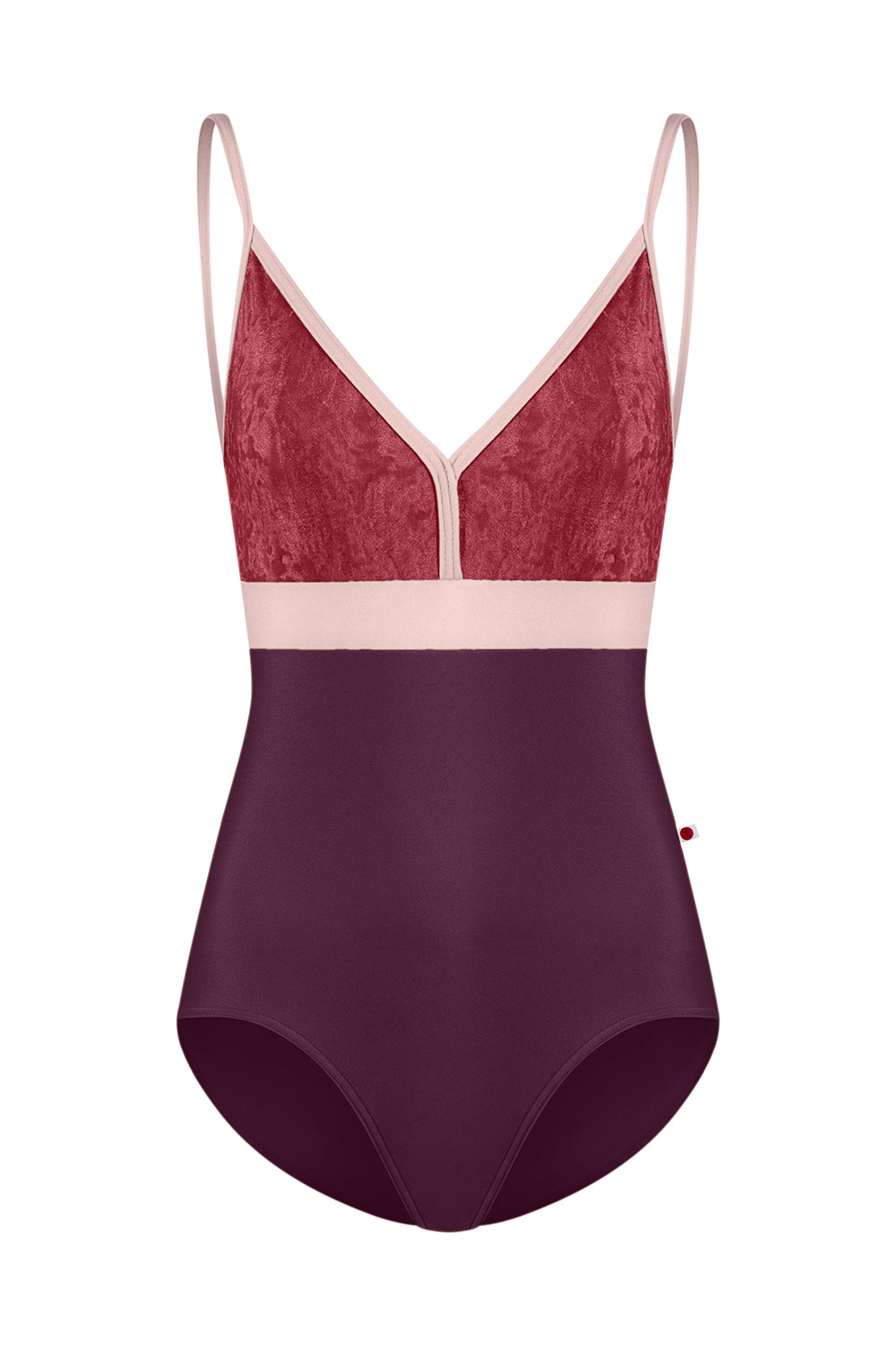 The Zoe leotard has retro appeal with a color-block empire waistband and v-neckline.
